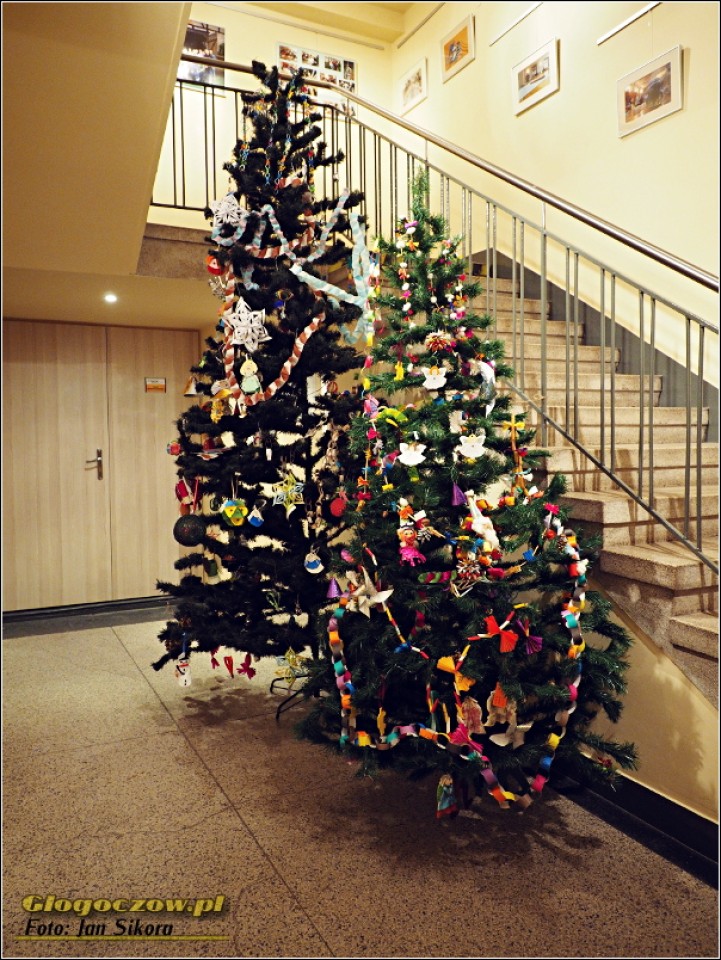Choinki ubrane wykonanymi w ramach konkursu ozdobami